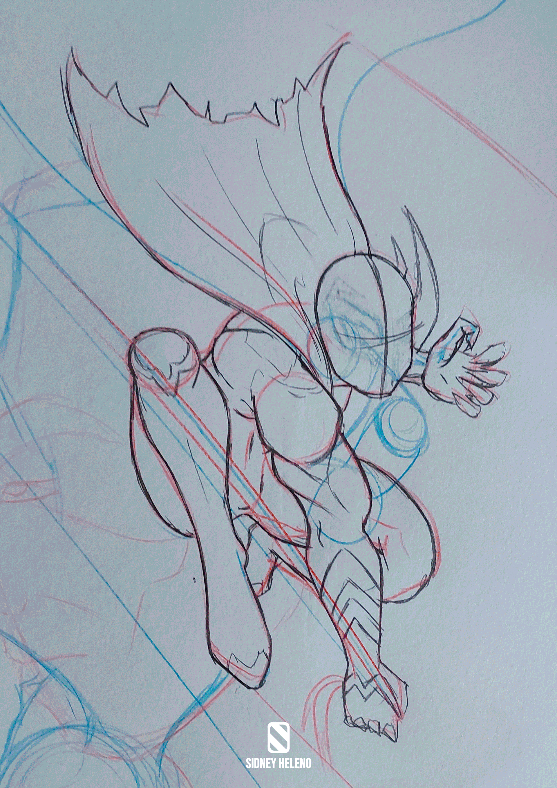 I decided to study some of the character's expressions with the intention of making him without the mask in the illustration. But I ended up not doing it, because I think he's more iconic with the mask. Also, I made a sketch of his torso to test the hatching on the uniform.